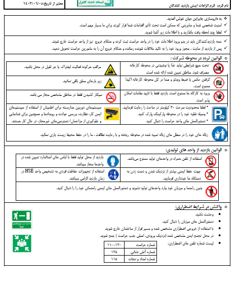 فرم مربوطه با ارائه اطلاعات کامل و اشنایی با الزامات و خطرات موجود در سازمان به بازدیدکنندگان و رعایت قوانین داخلی توسط انها از وقوع هرگونه رویدادی پیشگیری می نماید.
