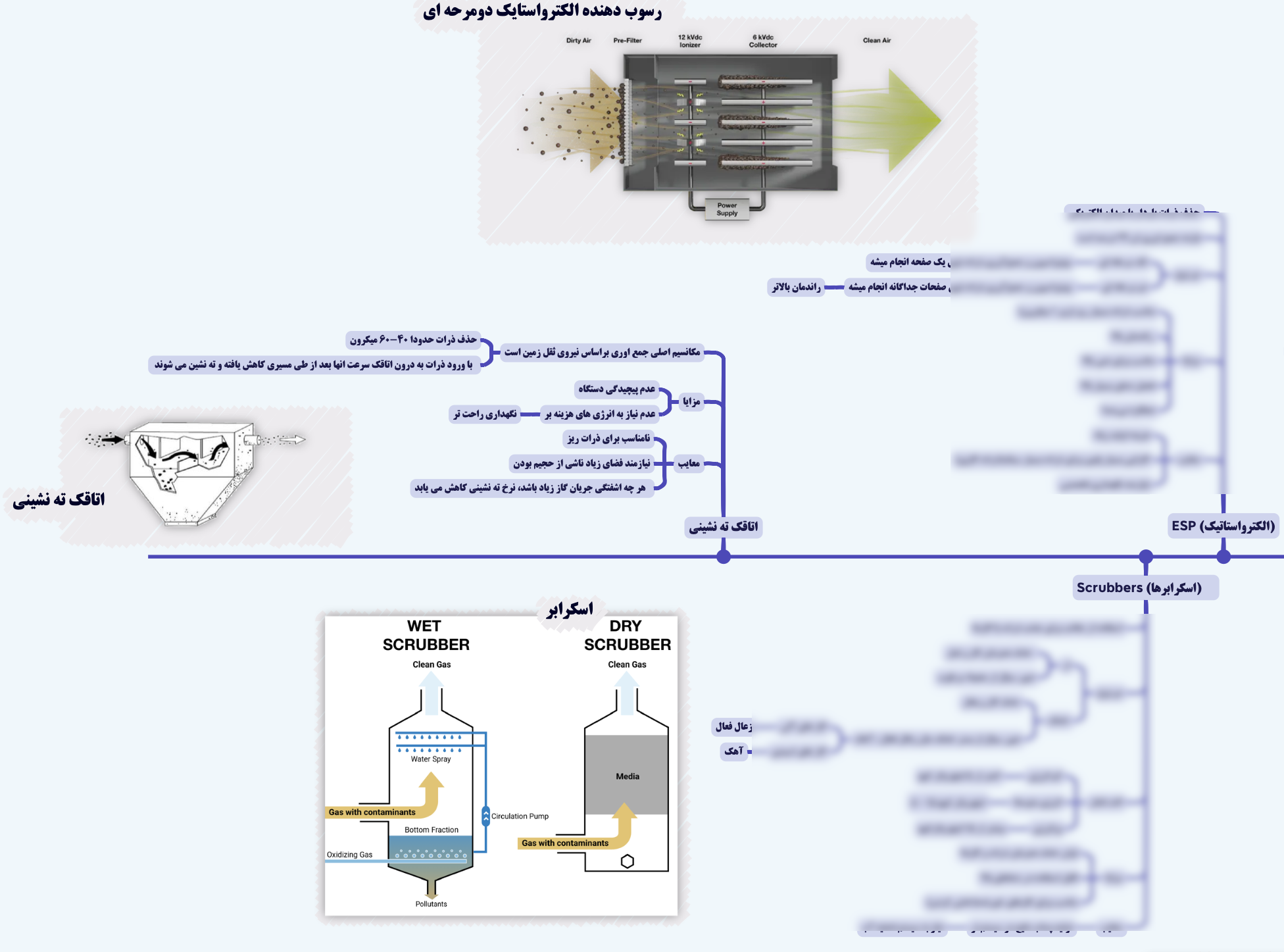 • غبارگیر ها و فیلتراسیون (‌انواع فیتر ها و مکانیزم برخورد ها، سیکلون ، اسکرابر تر و خشک ، الکترواستاتیک و اتاقک های ته نشینی )